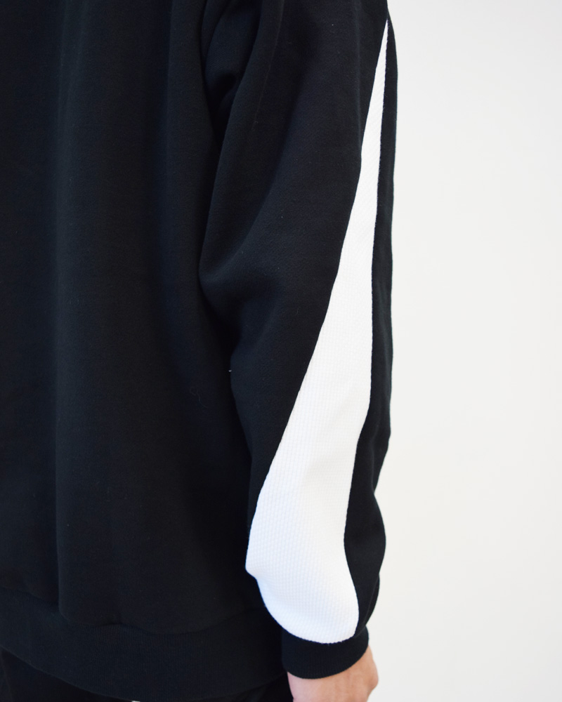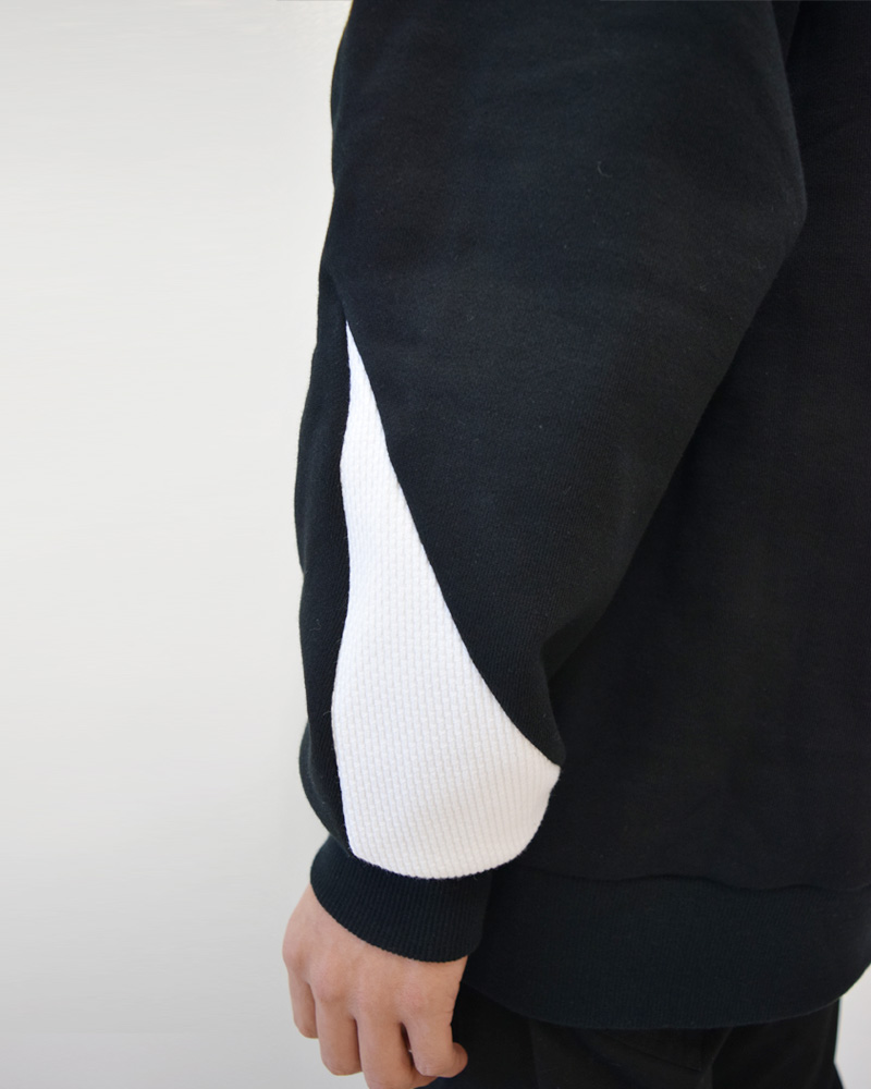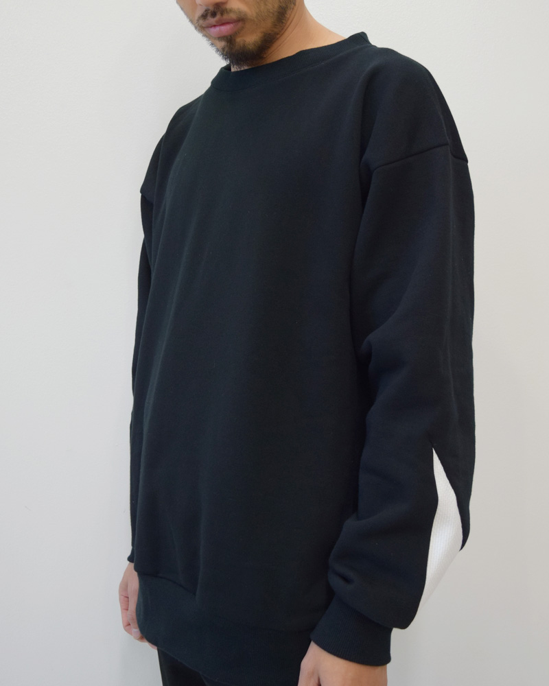 The asymmetrical fabric panels made from sashiko-style woven material on both sleeves add a subtle yet distinctive variation to the overall design.