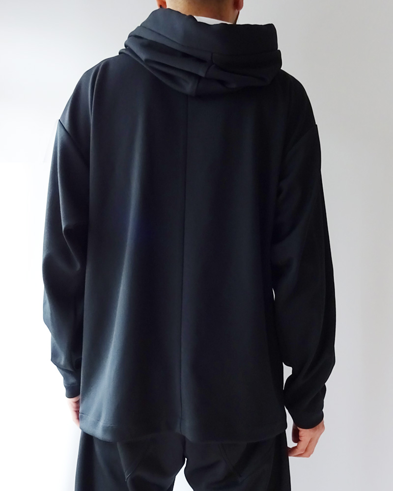 This pullover hooded haori jacket is made from jersey fabric. It features a large hood and a fluffy collar reminiscent of a dotera (a traditional Japanese robe).