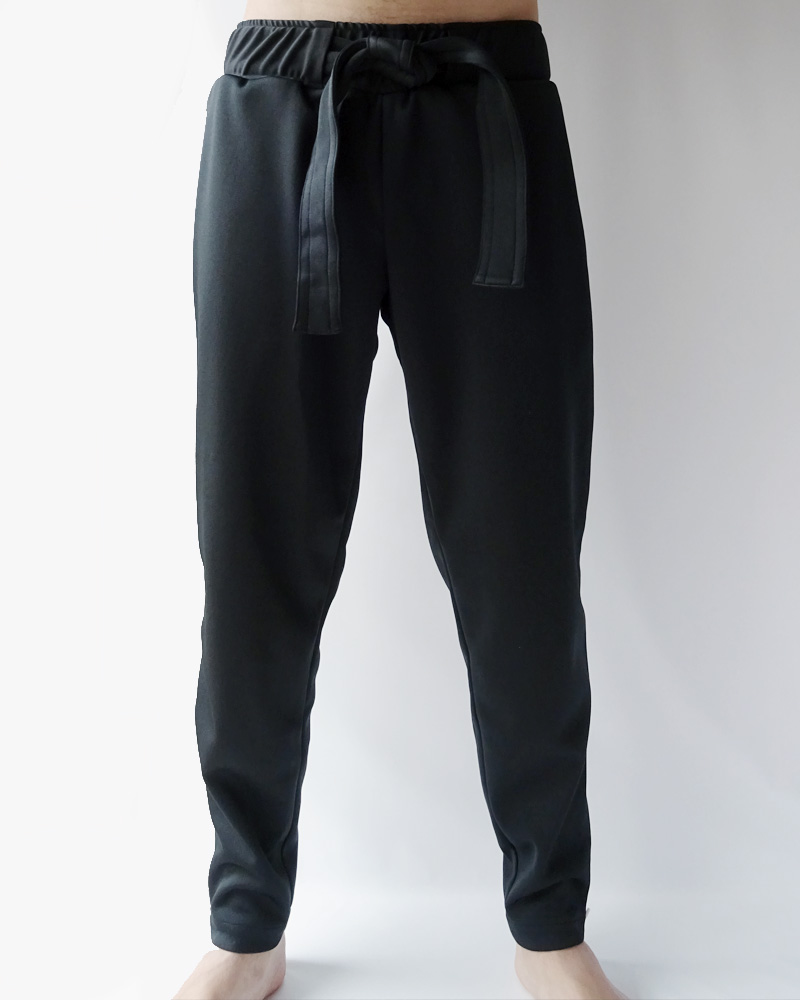 These samue pants, made from jersey fabric, feature a sleek silhouette. The waist is adjustable with a wide belt-like waist cord, mimicking the look of a martial arts obi.