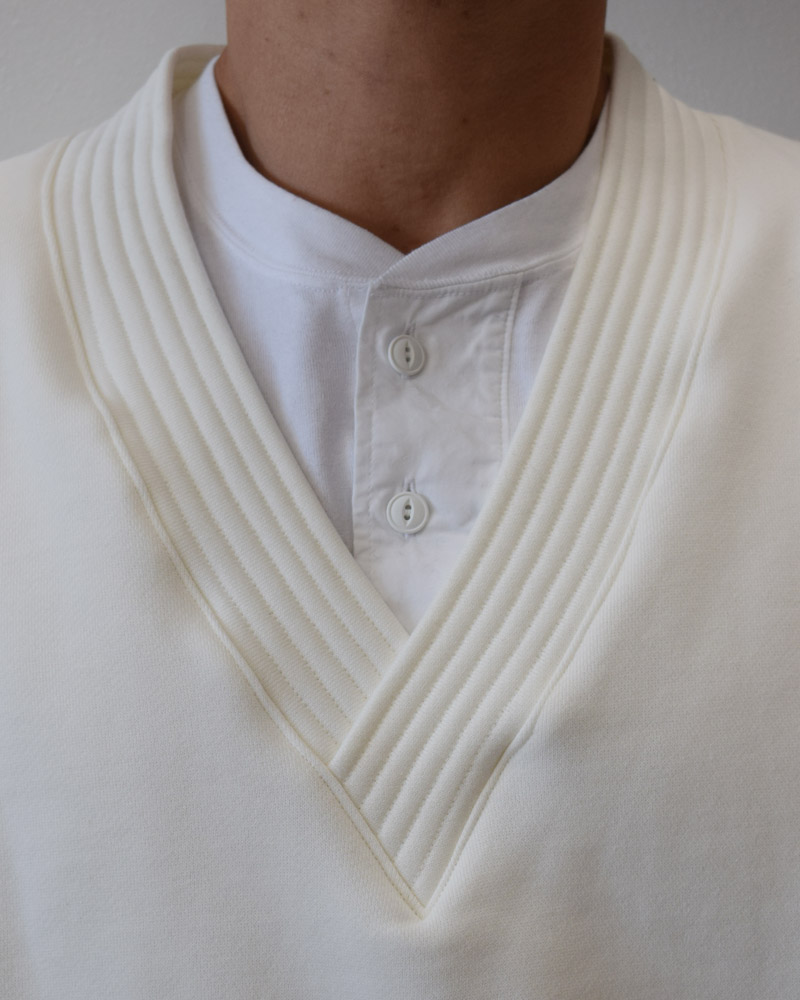 Yoshiyuki’s classic sweatshirt has been updated with a new fabric and silhouette. The thick collar, reminiscent of traditional martial arts uniforms, remains, but the fit has been made even more relaxed, with a fuller silhouette. The fabric is made from a dense, brushed back material, slowly knitted on an old-fashioned knitting machine, creating a unique softness and fullness that cannot be achieved with faster machines.