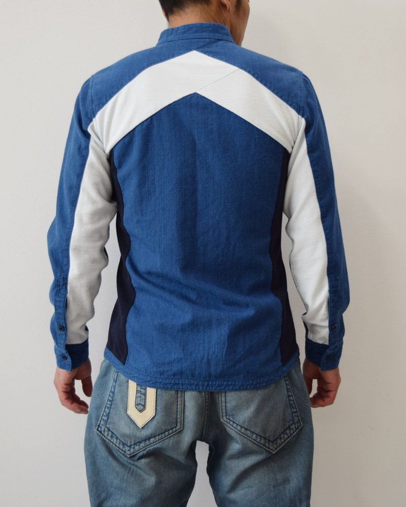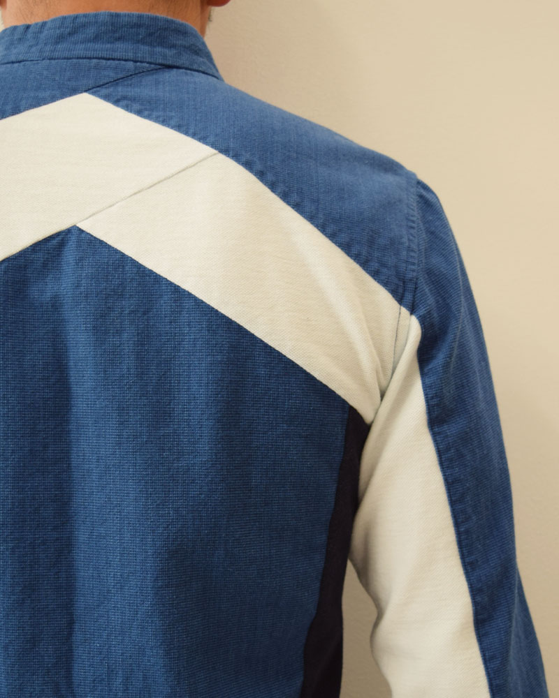 This long-sleeve shirt features a geometric design with straight, horizontal and vertical panel seams and a stand collar. Made from indigo-dyed oxford chambray with rich texture, the shirt incorporates stretchable pique fabric (also indigo-dyed) under the sleeves and along the sides of the body.