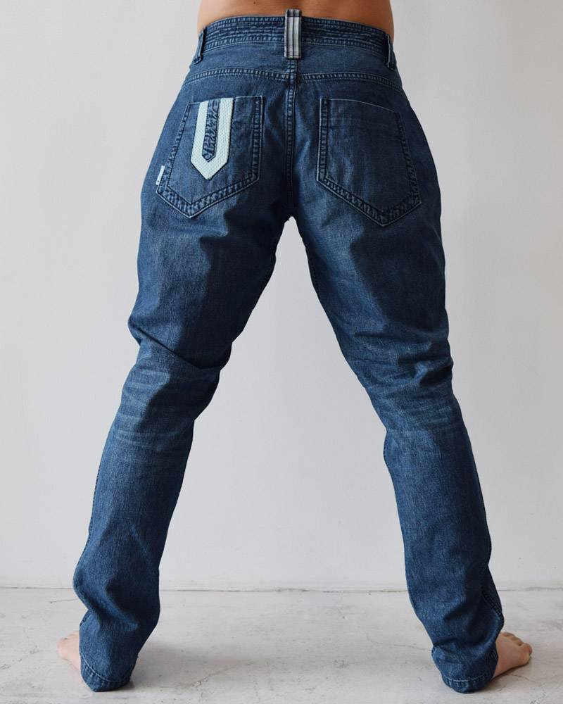 The design includes gussets in the inner thighs for enhanced mobility, similar to traditional martial arts attire, and reinforced stitching around the front pockets inspired by martial arts belts. Additional details, such as the Sanada-himo belt loopsand the “Kakushi Kikko” (hidden hexagon) pattern, represented in sashiko woven cotton on the left rear pocket, serve as hallmark features of Yoshiyuki’s craftsmanship.