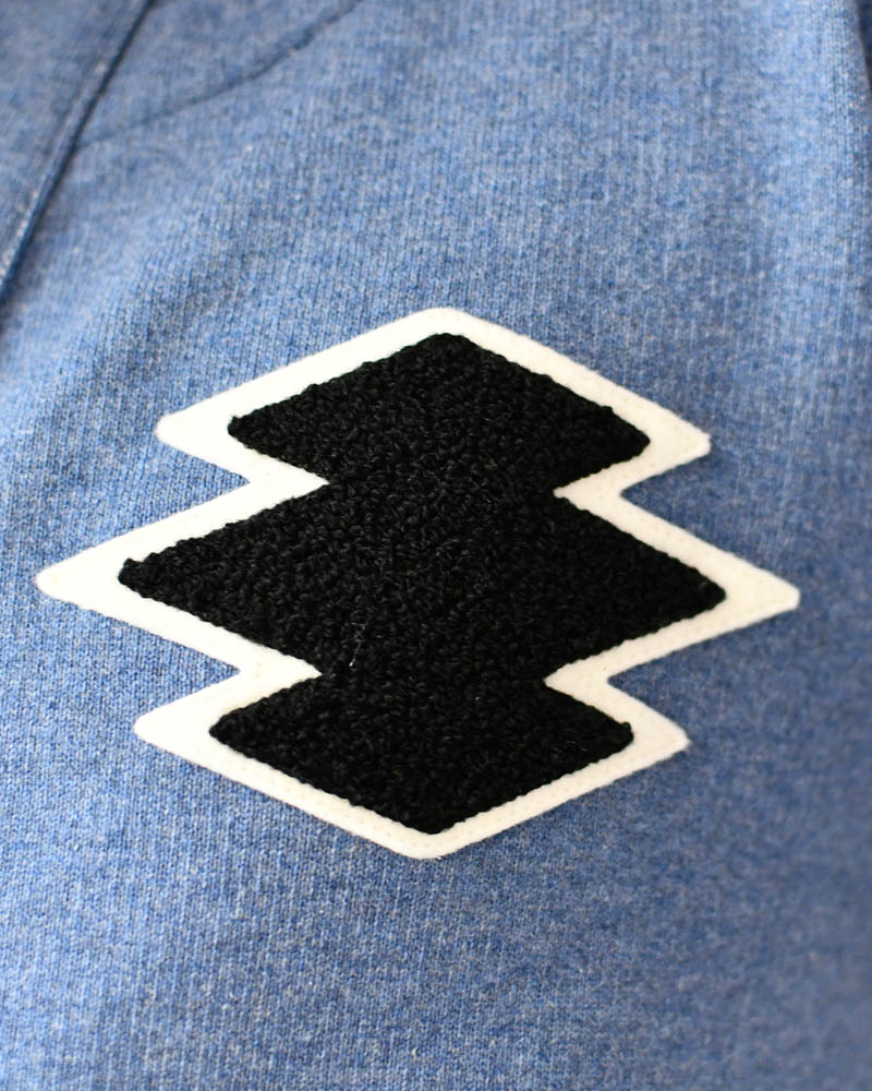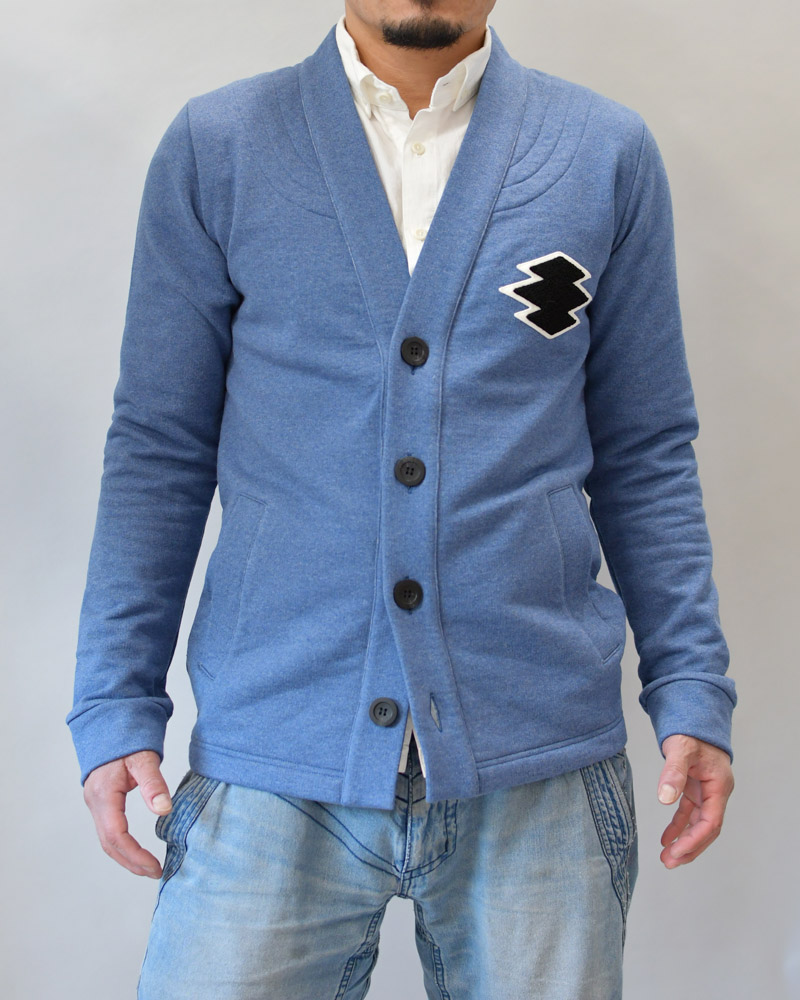 A front-opening haori with four buttons, made from thick, firm sweatshirt material. This versatile piece combines a clean cardigan style with the strong, functional feel of a traditional aikido uniform reinforcement. The left chest features a Sagara embroidery patch of the “Matsukawabishi” crest, giving it an active, sporty vibe reminiscent of a university athletic club.
