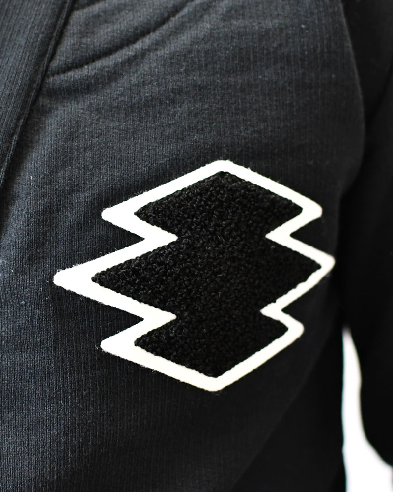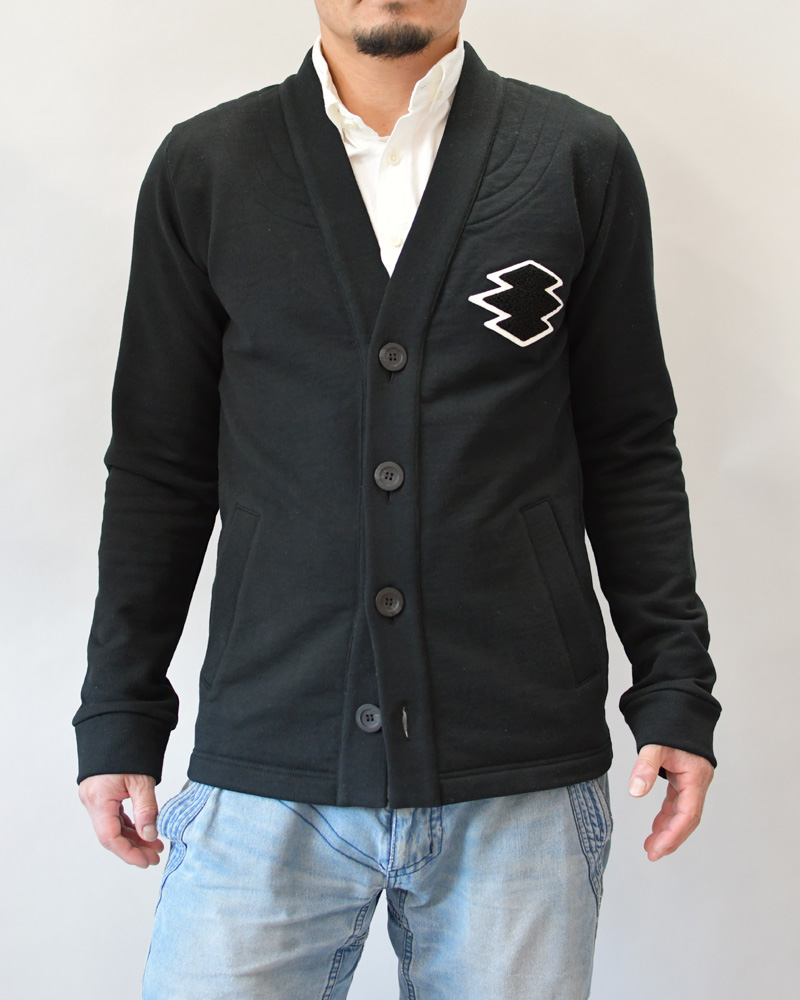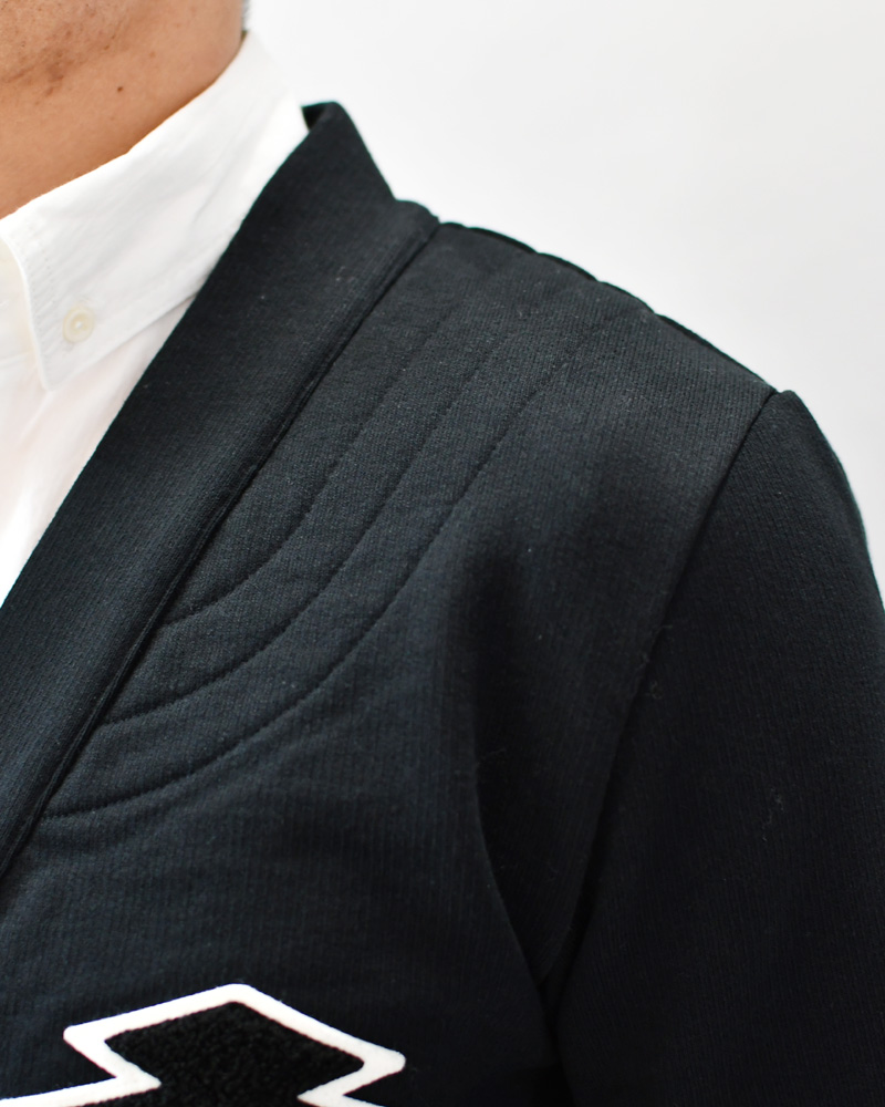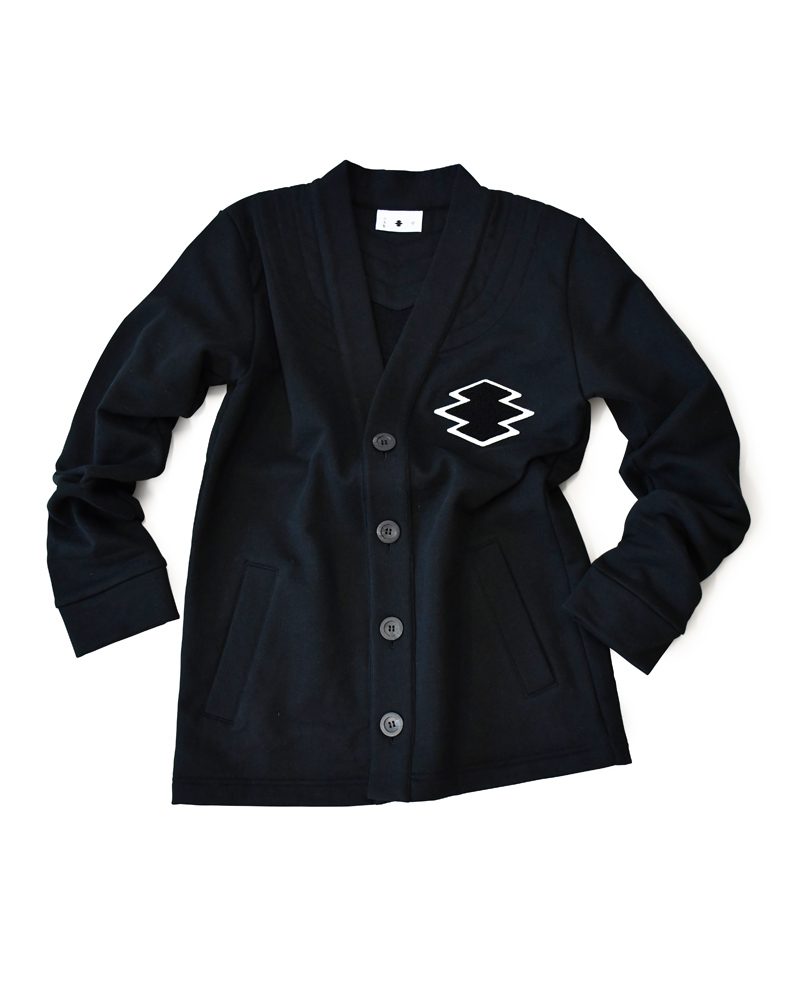 A front-opening haori with four buttons, made from thick, firm sweatshirt material. This versatile piece combines a clean cardigan style with the strong, functional feel of a traditional aikido uniform reinforcement. The left chest features a Sagara embroidery patch of the “Matsukawabishi” crest, giving it an active, sporty vibe reminiscent of a university athletic club.