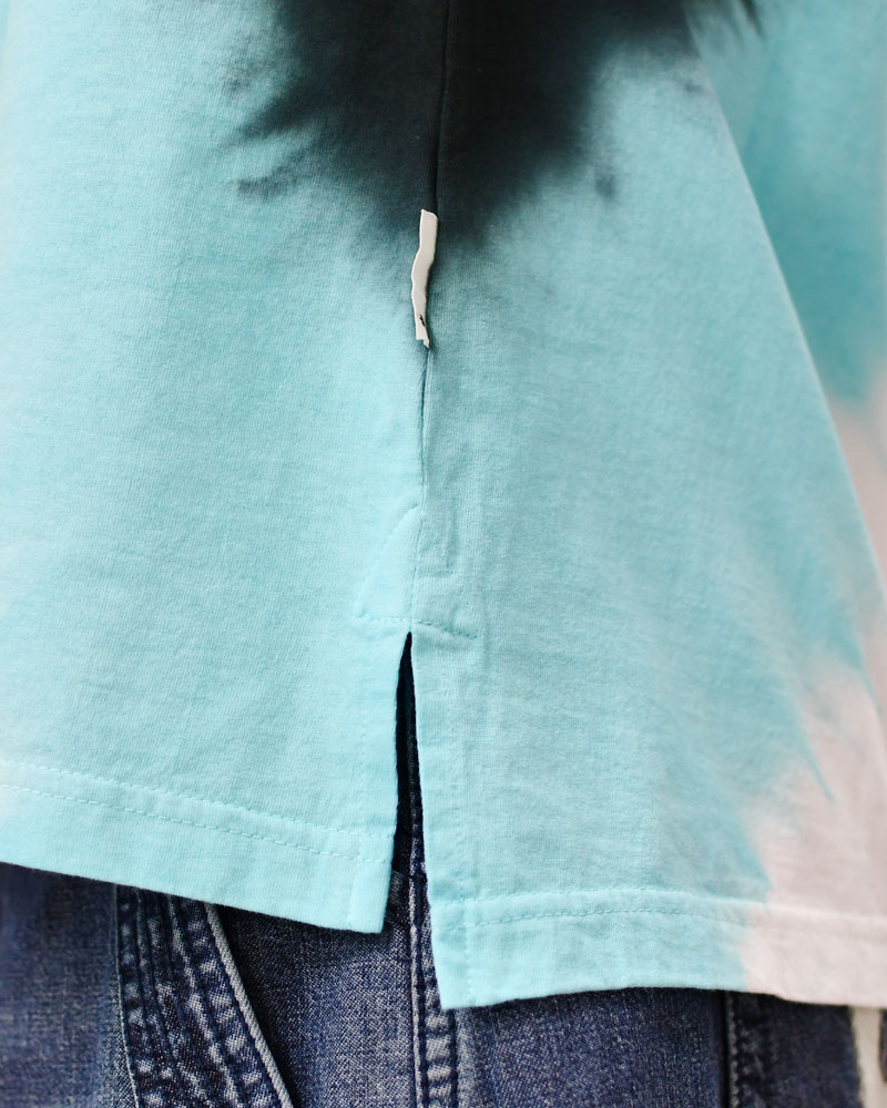 A loose-fitting short-sleeve T-shirt featuring a diagonal two-tone dip-dye effect. The garment is suspended and dipped in dye using a traditional dip-dyeing technique, where the dye is absorbed over a set period of time. This method is skillfully applied diagonally by artisans to create a beautiful gradient effect. The fabric is made from medium-weight, tightly woven jersey knit using air-spun yarn. The surface of the fabric has a smooth, slightly firm texture, but thanks to the air trapped between the fibers, it gives a soft, voluminous feel when worn. The T-shirt offers a dry touch, excellent moisture absorption, and a natural, comfortable wearing experience.