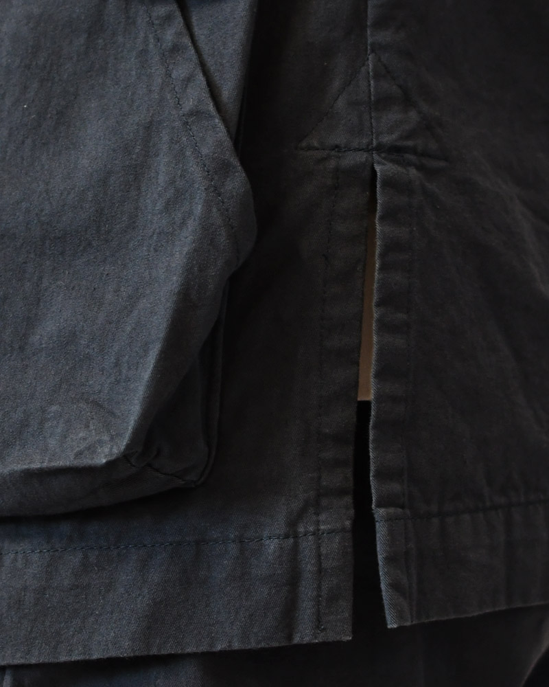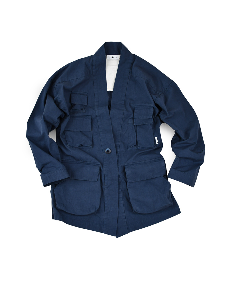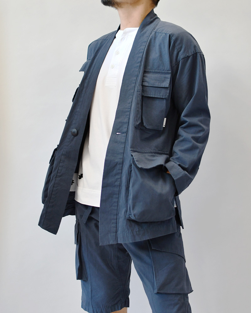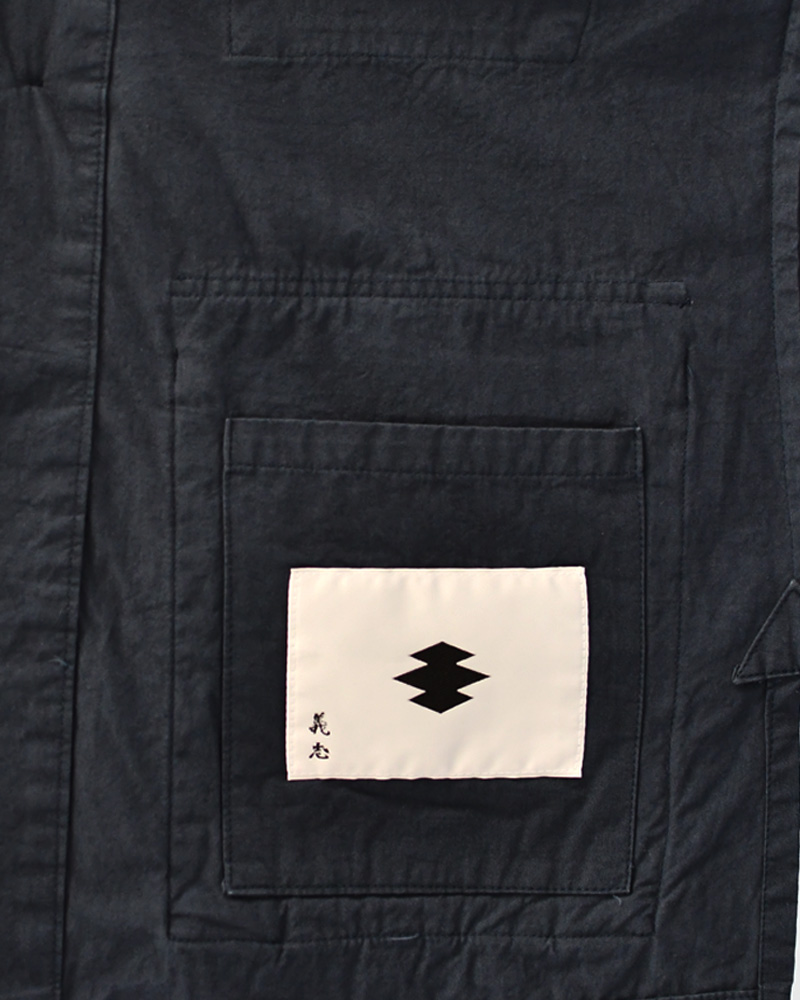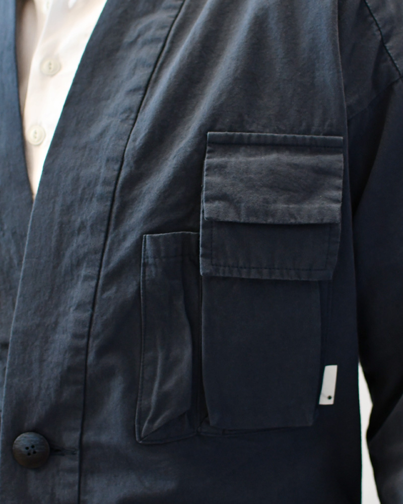 This Yamato haori jacket features a high storage capacity with a total of 11 functional pockets on both the outer and inner front panels. Inspired by work jackets and fishing vests, its design is tailored for everyday use in the city. It’s designed to hold all the small items you carry in daily life, such as a mobile phone, glasses, keys, pens, hand towels, masks, cigarettes, and lighters.This particular color is made from a blend of cotton and linen (flax), which is different from the “Navy” and “Matsu-ba” options.