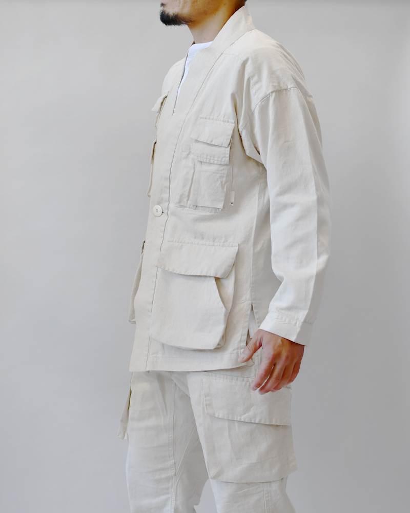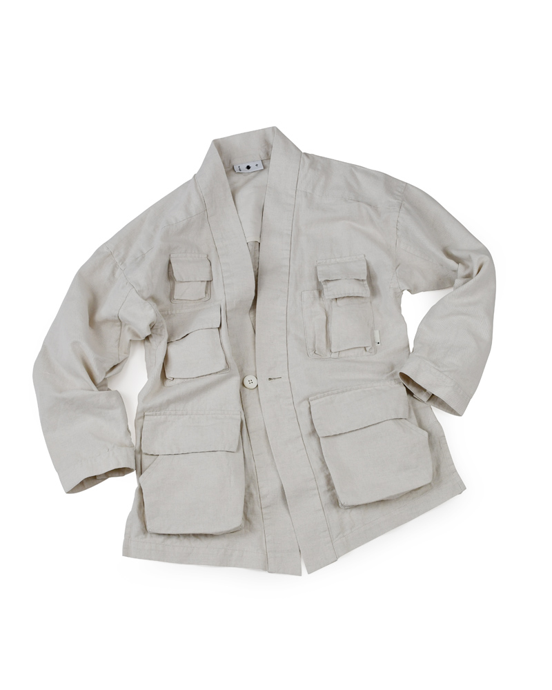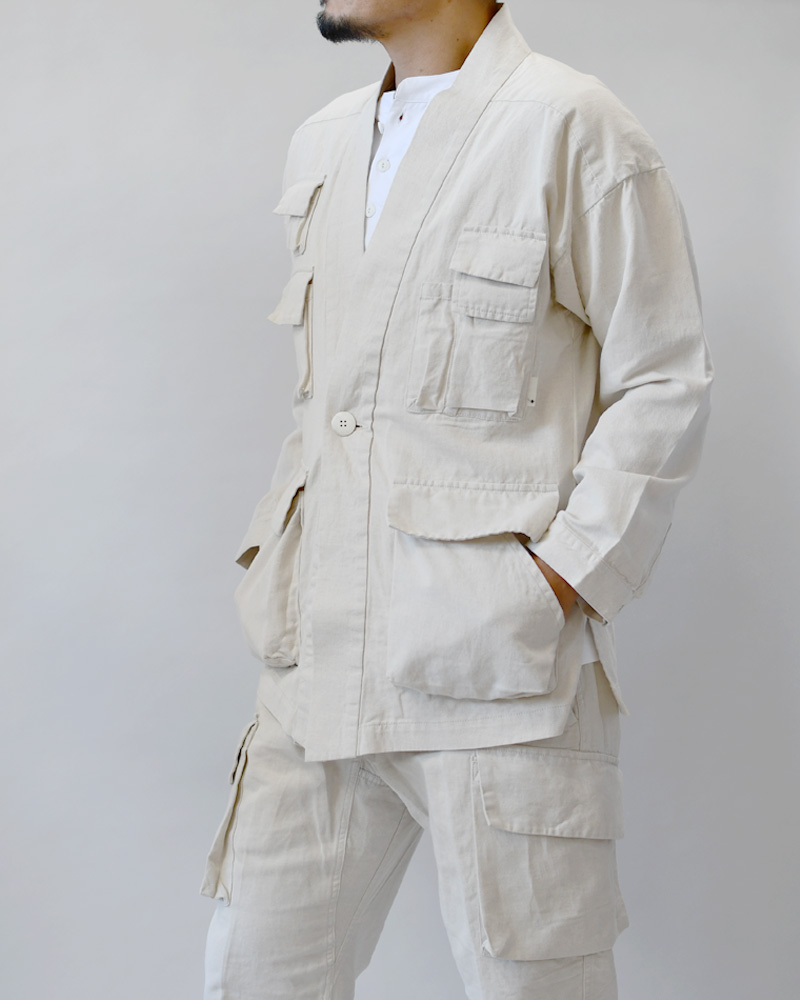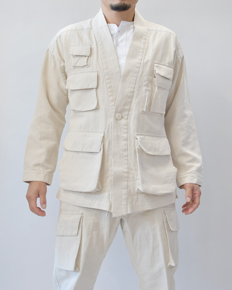 This Yamato haori jacket features a high storage capacity with a total of 11 functional pockets on both the outer and inner front panels. Inspired by work jackets and fishing vests,its design is tailored for everyday use in the city. It’s designed to hold all the small items you carry in daily life, such as a mobile phone, glasses, keys, pens, hand towels,masks, cigarettes, and lighters.This particular color is made from a blend of cotton and linen (flax), which is different from the “Navy” and “Matsu-ba” options.