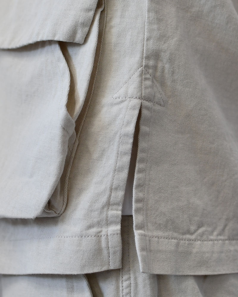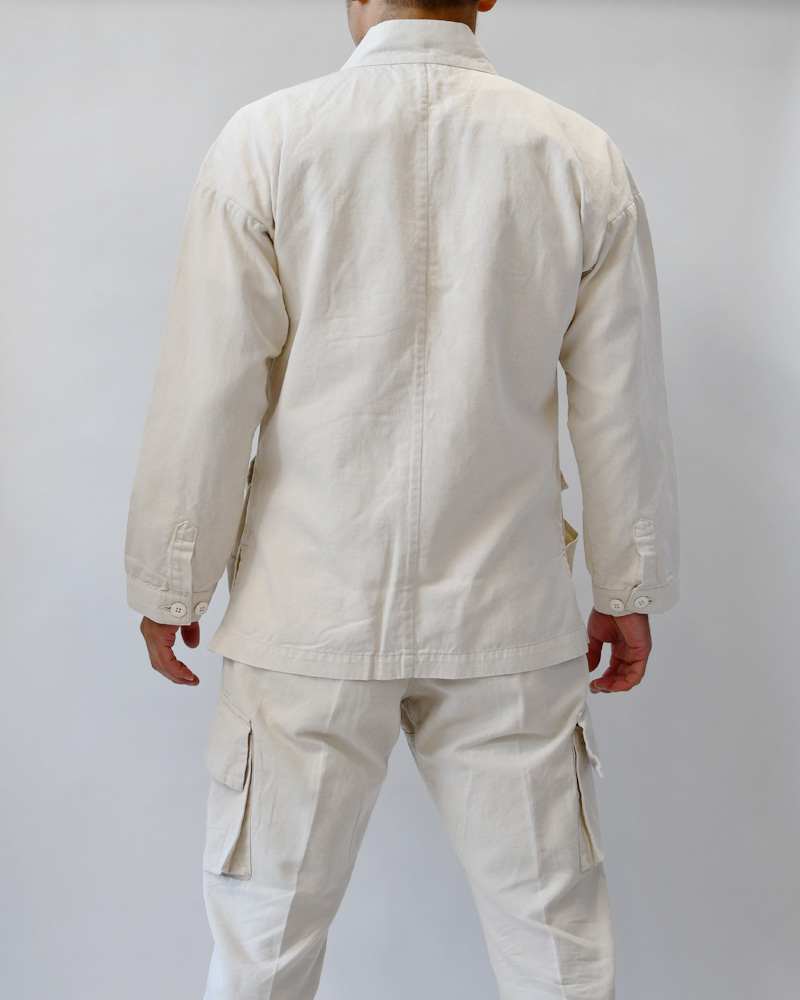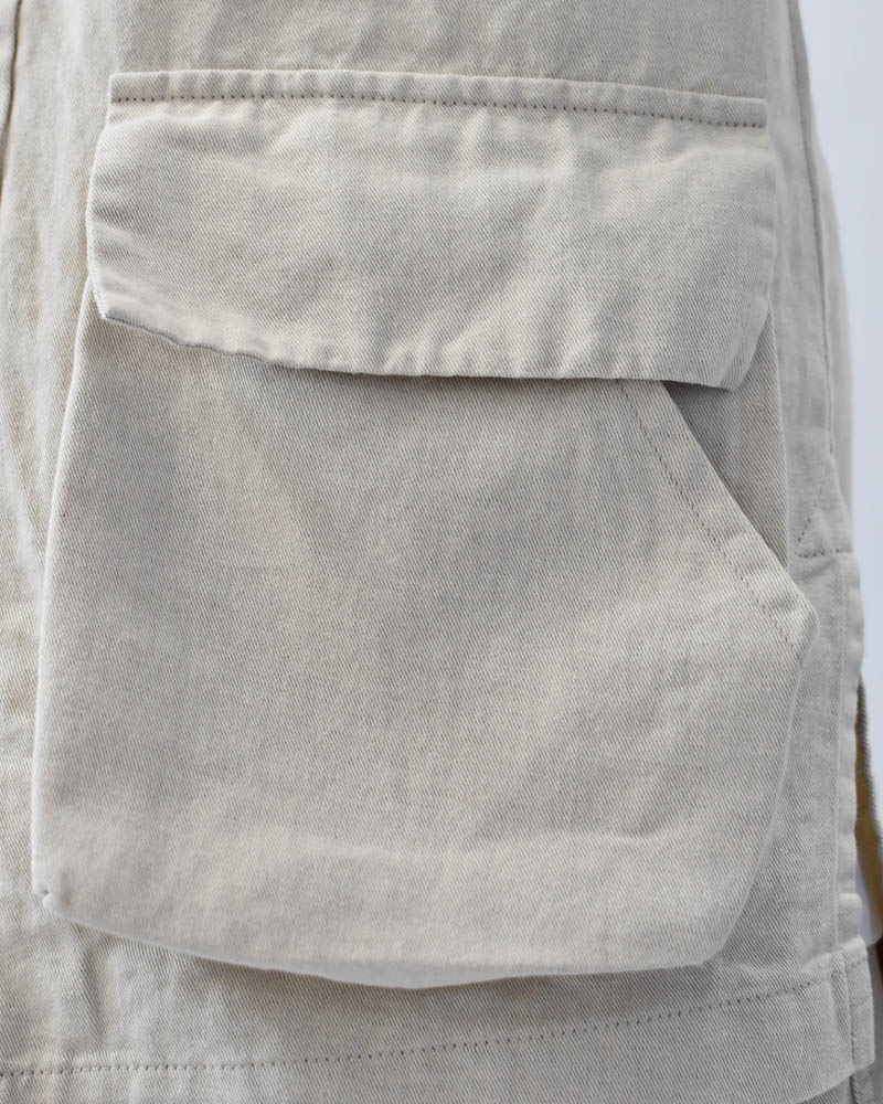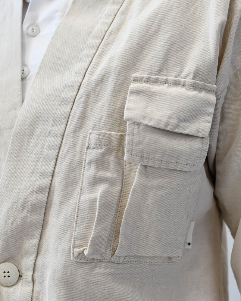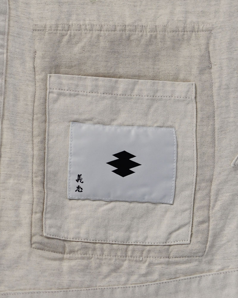 This Yamato haori jacket features a high storage capacity with a total of 11 functional pockets on both the outer and inner front panels. Inspired by work jackets and fishing vests,its design is tailored for everyday use in the city. It’s designed to hold all the small items you carry in daily life, such as a mobile phone, glasses, keys, pens, hand towels,masks, cigarettes, and lighters.This particular color is made from a blend of cotton and linen (flax), which is different from the “Navy” and “Matsu-ba” options.
