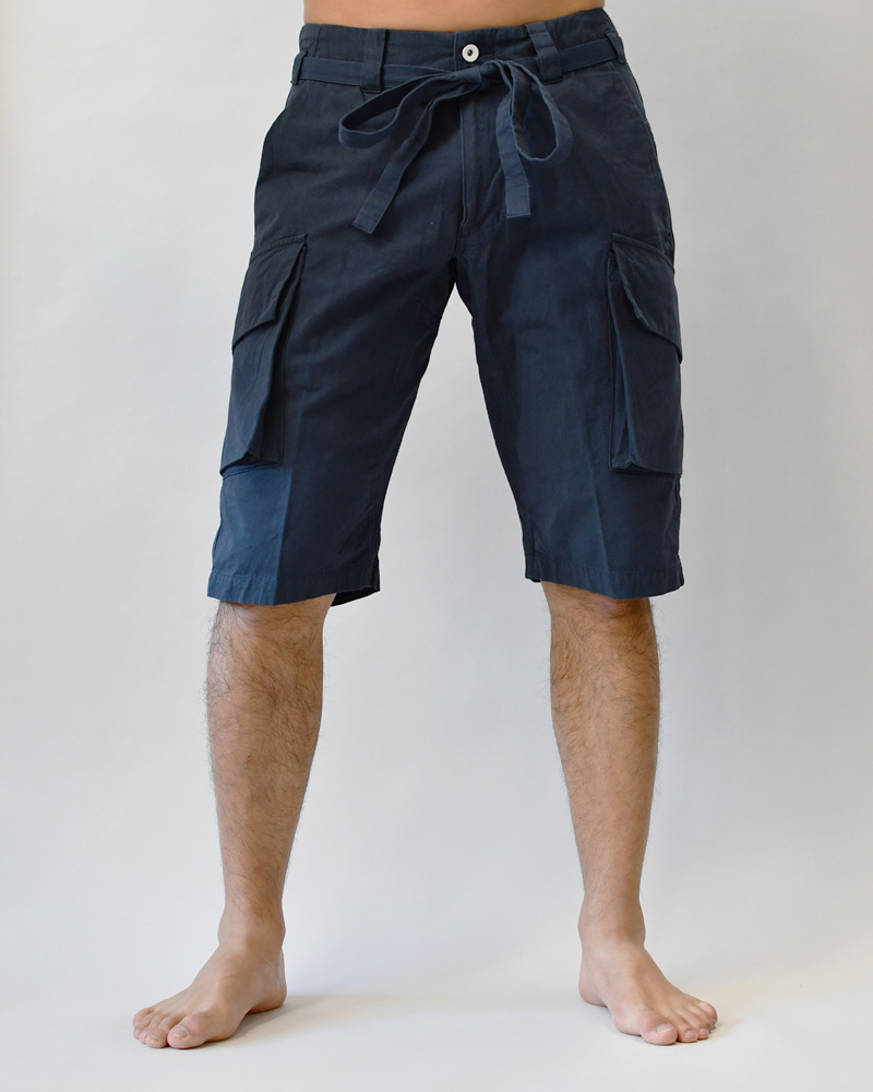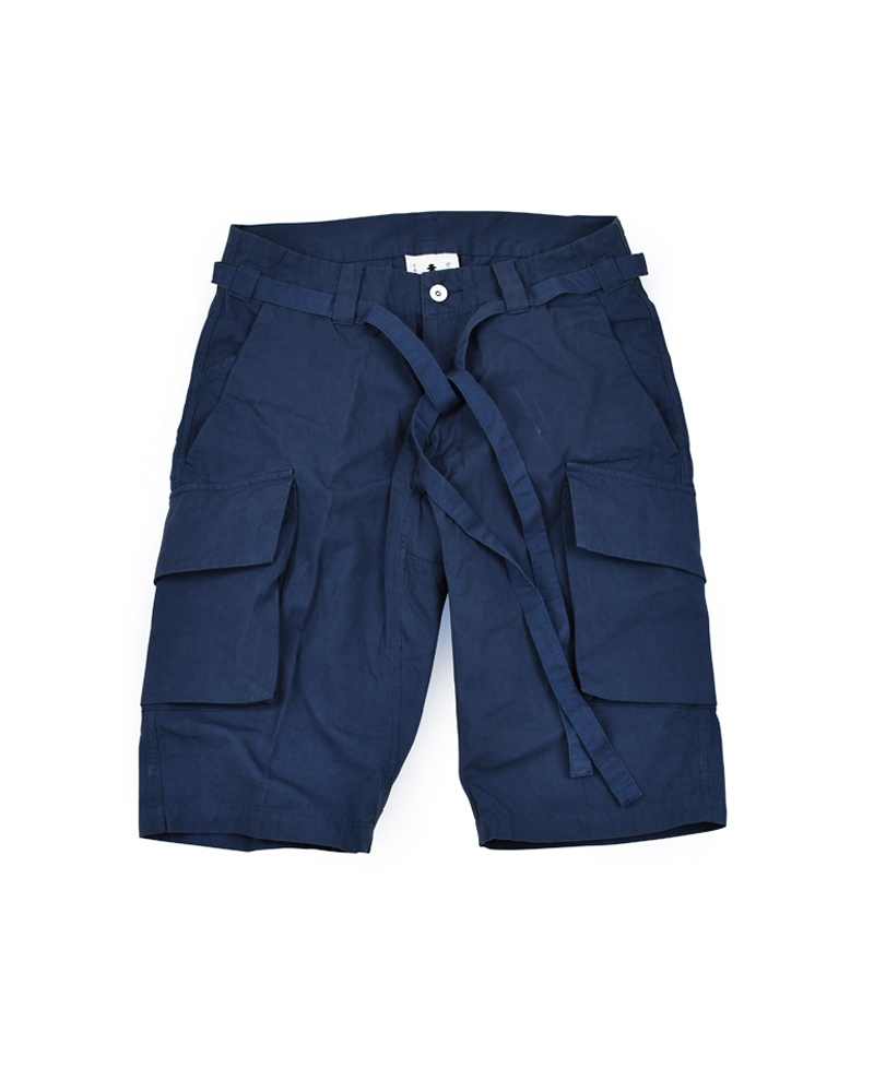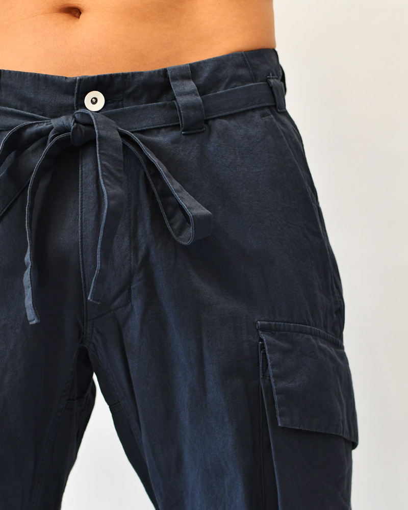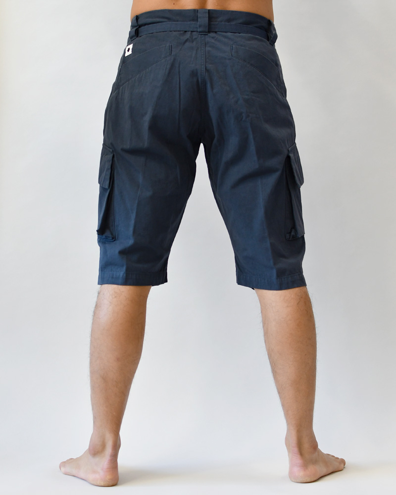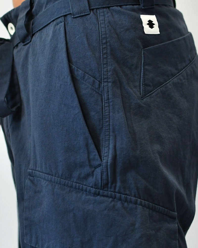 This knee-length version of the Danbukuro model features a workwear-inspired design with high storage capacity, including cargo pockets on the thighs and double-layer front pockets,for a total of eight pockets front and back.The fabric is a carefully hand-dyed chino material, dried under the strong winds and sunlight of the Enshu region.
