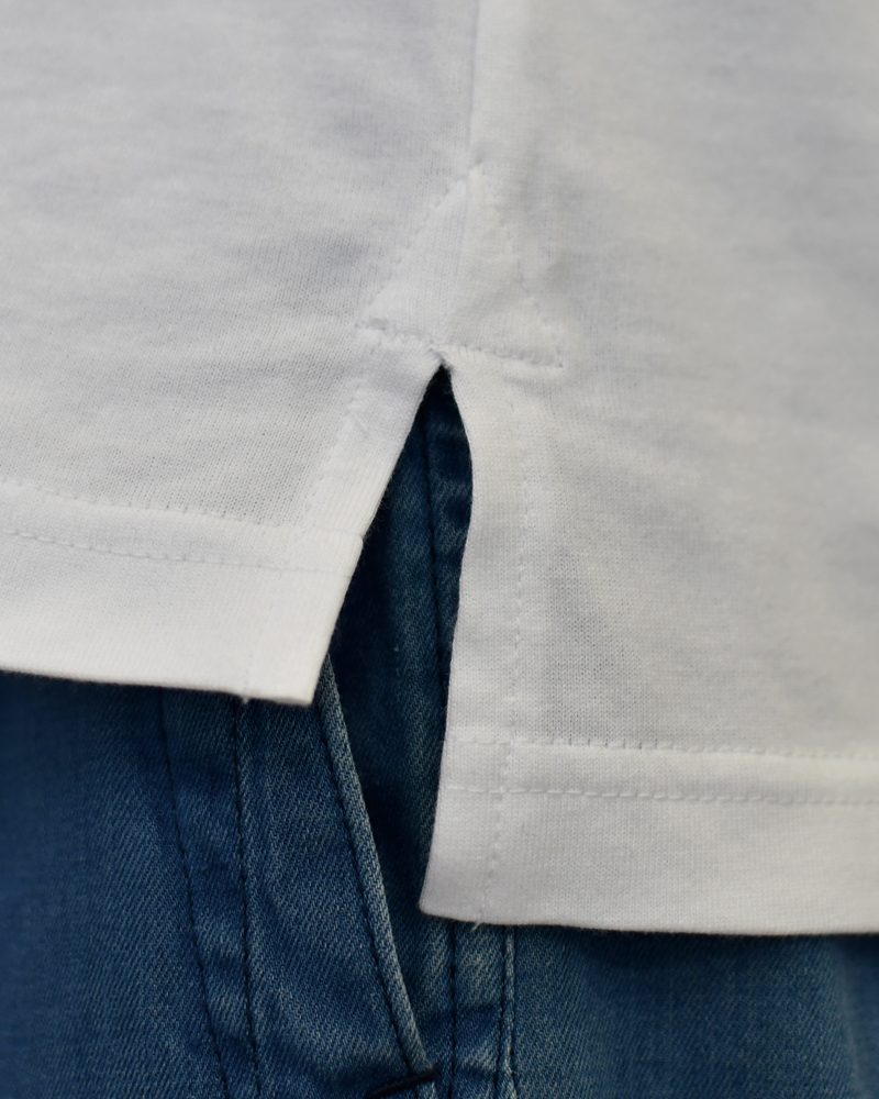 The design is simple yet carefully detailed, featuring a thick binder finish on the collar, expertly cut sleeves that allow for a stylish roll-up,and side slits at the hem to enhance the silhouette. All these elements reflect Yoshiyuki’s unique t-shirt philosophy.
