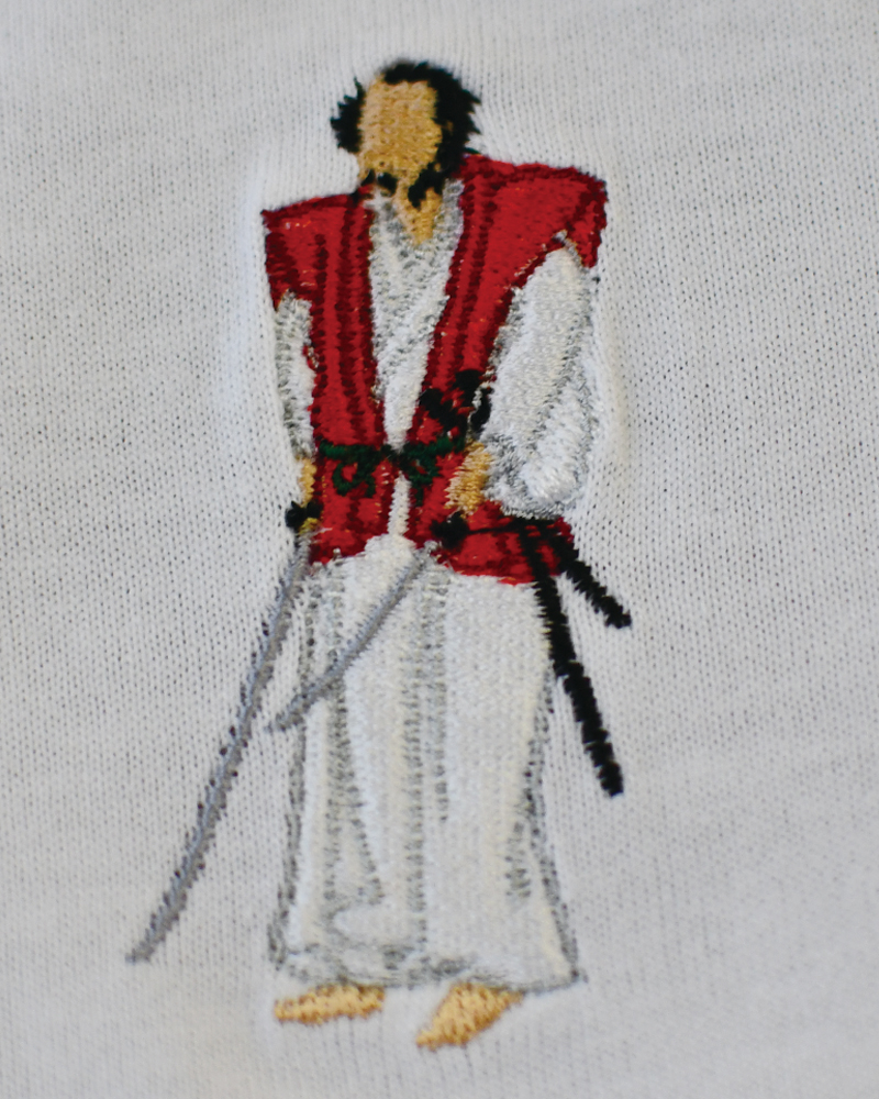 The “Niten” pattern uses the iconic image of the famous swordsman, depicted in a small, embroidered portrait that is instantly recognizable to anyone familiar with his likeness.